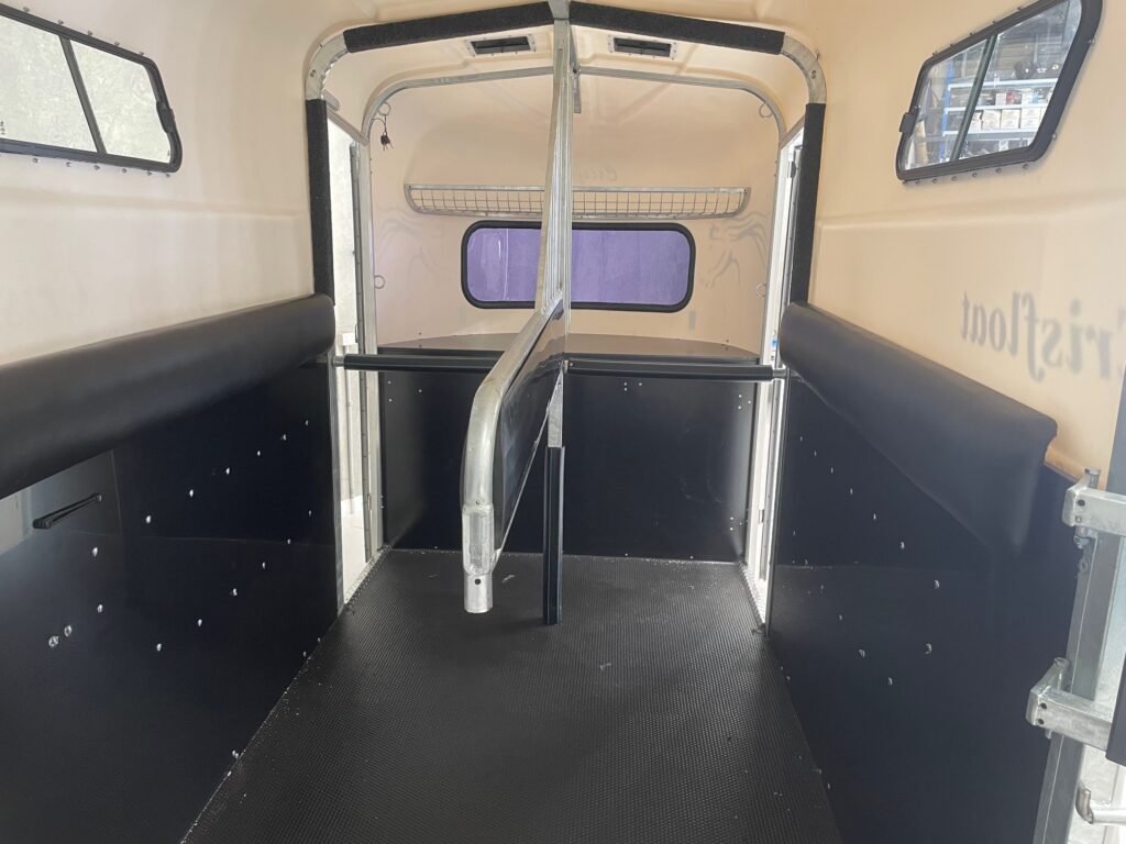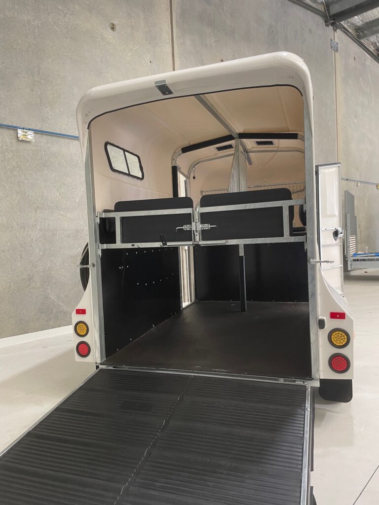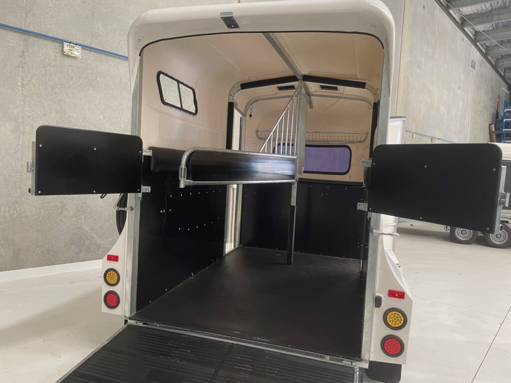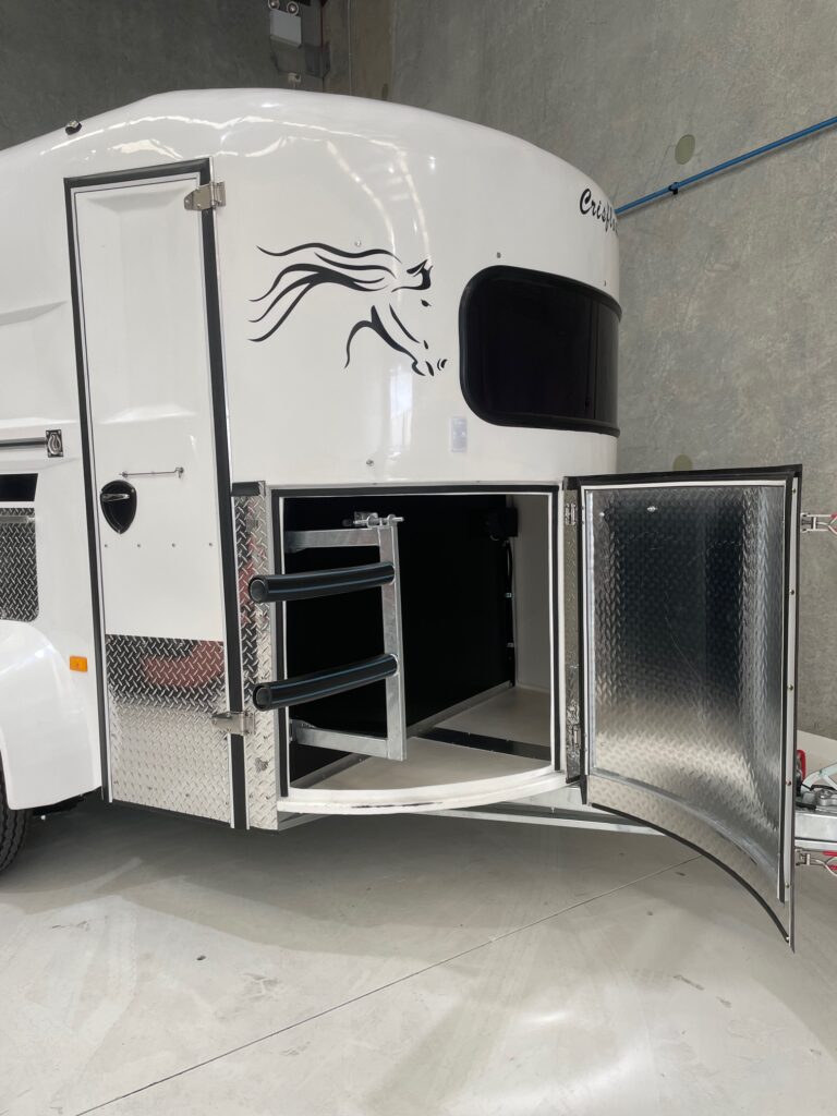Large front tack box with external access door Swing out saddle racks in tack box and bridle hooks Internal tack box access door added.